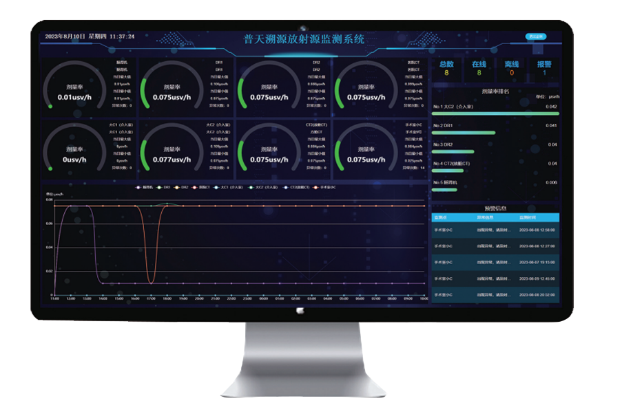 根据医院需求设置监测点位,监测数据实时上传系统,支持查看放射源的监测指标是否合格;对于有异常情况系统设置报警提示,方便及时发现并处理